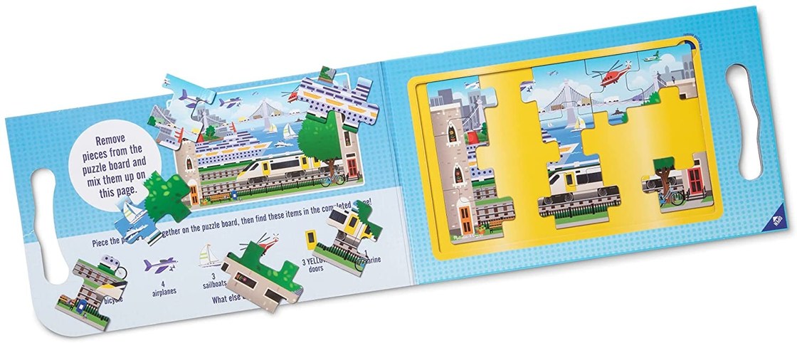 Enjoying puzzle fun anytime, anywhere has never been easier! This portable play set includes two 15-piece magnetic puzzles in a compact foldable form with an exciting vehicle scene and built-in carry handle! Shape-coded on the back for easy sorting, and affixed to interior surfaces to minimize clutter, this is a great travel activity for kids ages 3 and up. The set includes seek and find activities as an extra challenge after completing the puzzles! Puzzle games are a great way to encourage logical thinking, goal setting, and patience.