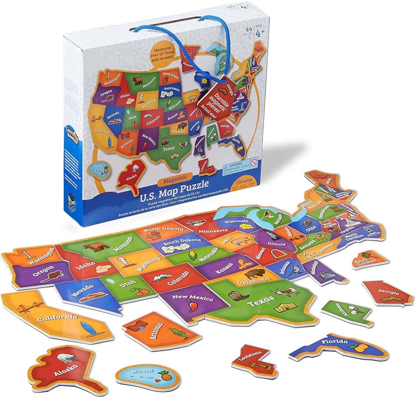 The puzzle's 43 magnetic pieces depict the names and shapes of all 50 states, as well as the region's famous landmarks, plants, and animals. It also includes a paper outline to help kids understand where each state is located